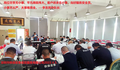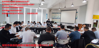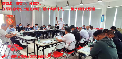 我司鐵保宏泰深圳保安公司在總經理王虎的帶領下召開安保主管及隊長等管理級人員會議,會議中大家暢所欲言,集思廣益,共同建造美好鐵保宏泰安保護衛。
