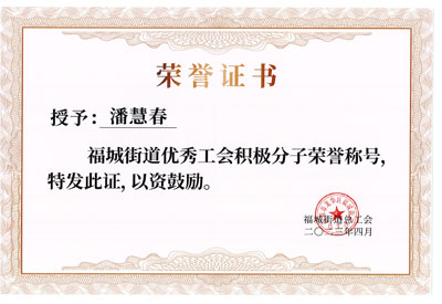 熱烈祝賀我司鐵保宏泰深圳保安公司安保對眼潘慧春同志榮獲深圳市龍華區(qū)福城街道優(yōu)秀工會(huì)積極分子榮譽(yù)稱號(hào)。