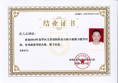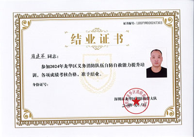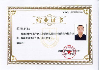 熱烈祝賀我司鐵保宏泰深圳保安公司龔文得、周建軍、趙元紅、金魯正、張晴等同志參加2024年龍華區義務消防隊伍自防自救能力提升培訓,各項成績考核合格特發此結業證。