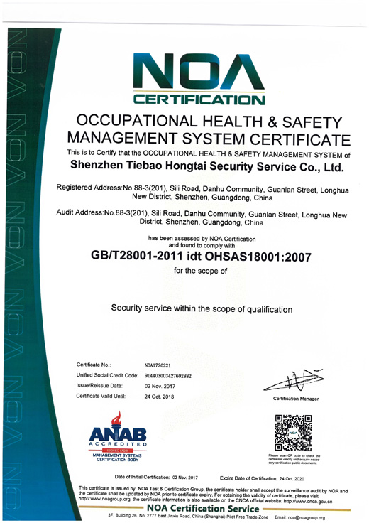 熱烈祝賀深圳市鐵保宏泰保安服務(wù)有限公司榮獲職業(yè)健康安全管理體系認(rèn)證證書。