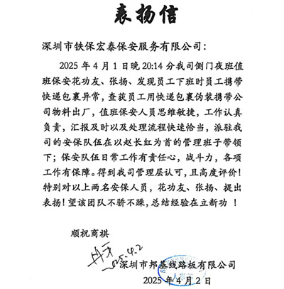 深圳邦基線路板公司致信表揚我司鐵保宏泰保安