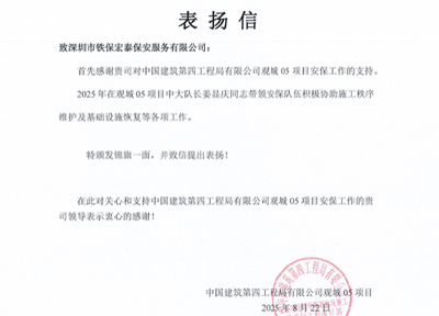 中國建筑第四工程局有限公司觀城05項(xiàng)目總承包工程項(xiàng)目部致信表揚(yáng)我司鐵保宏泰深圳保安公司安保大隊(duì)長姜顯慶同志帶領(lǐng)的安保隊(duì)伍積極協(xié)助施工秩序維護(hù)及基礎(chǔ)設(shè)施恢復(fù)等各項(xiàng)工作,特頒發(fā)錦旗一面,并致信提出表揚(yáng)。