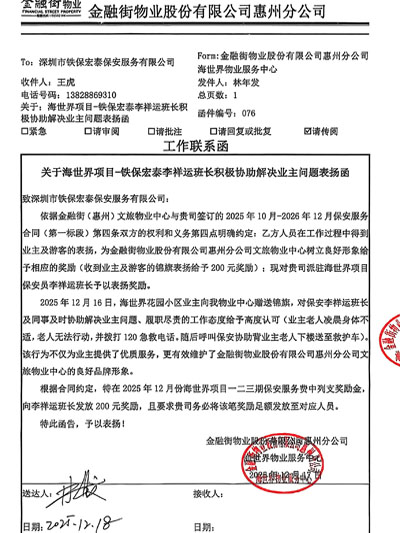 熱烈祝賀我司鐵保宏泰深圳保安公司保安員李祥運同志榮獲履職盡責給予高度的工作認可,金融街物業股份有限公司惠州分公司特此致信提出表揚。