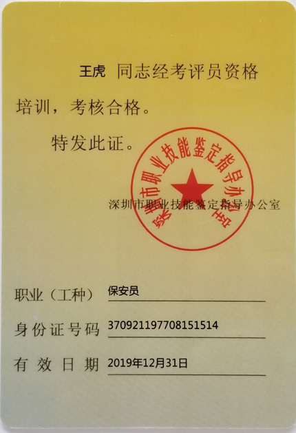 熱烈慶祝我司總經理王虎取得深圳職業技能鑒定考評員資格。