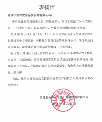 2018年11月8日及11月17日,貴司保安隊(duì)員張義生及談宏權(quán)在執(zhí)勤過(guò)程中文明執(zhí)勤,嚴(yán)格按照我司門禁管理制度執(zhí)行,體現(xiàn)專業(yè)的安保服務(wù),深受我司高層的高度贊揚(yáng)及工作的肯定。