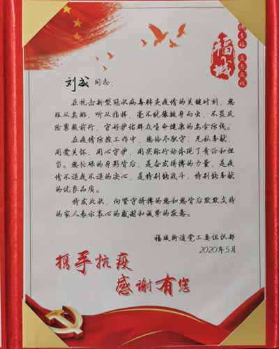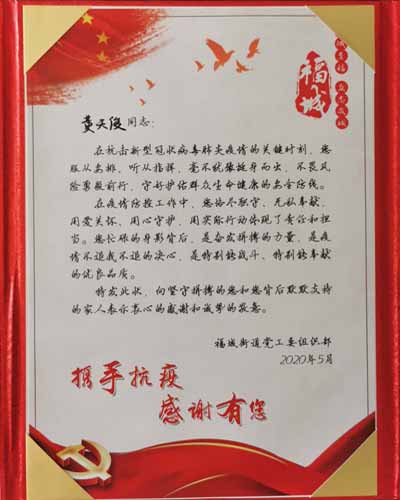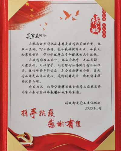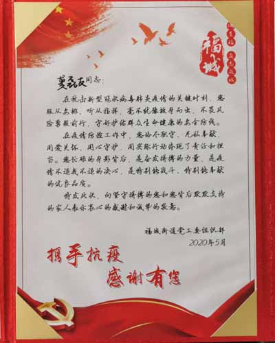 特發此狀,向堅守拼搏的您和您肯后默默支持的家人表示衷心的感謝和誠摯的敬意。