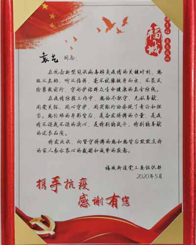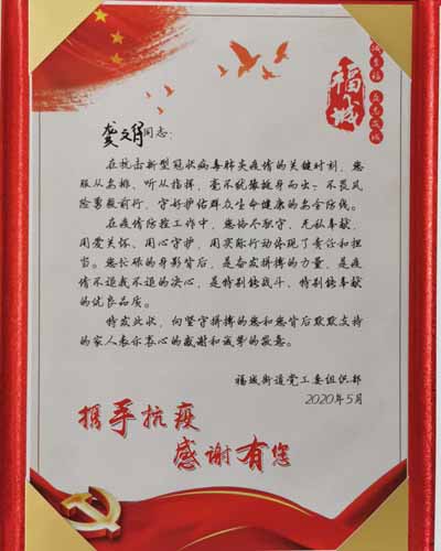 在疫情防控工作中,您格盡職守、無私奉獻,用愛關懷、用心守護,用實際行動體現了責任和擔當。您忙碌的身影背后,是奮發拼搏的力量,是疫情不退我不退的決心,是特別能戰斗、特別能奉獻的優良品質。