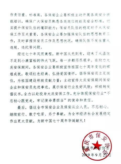 2019年9月23日,重慶市保安協(xié)會向全市保安企業(yè)、全體保安員發(fā)出倡議書,倡議全市保安企業(yè)及保安從業(yè)人員,不忘初繼續(xù)前行、敢于吃苦、樂于奉獻(xiàn),為全市經(jīng)濟(jì)社會發(fā)展穩(wěn)定作出更大貢獻(xiàn),為新中國七十周年華誕獻(xiàn)禮!